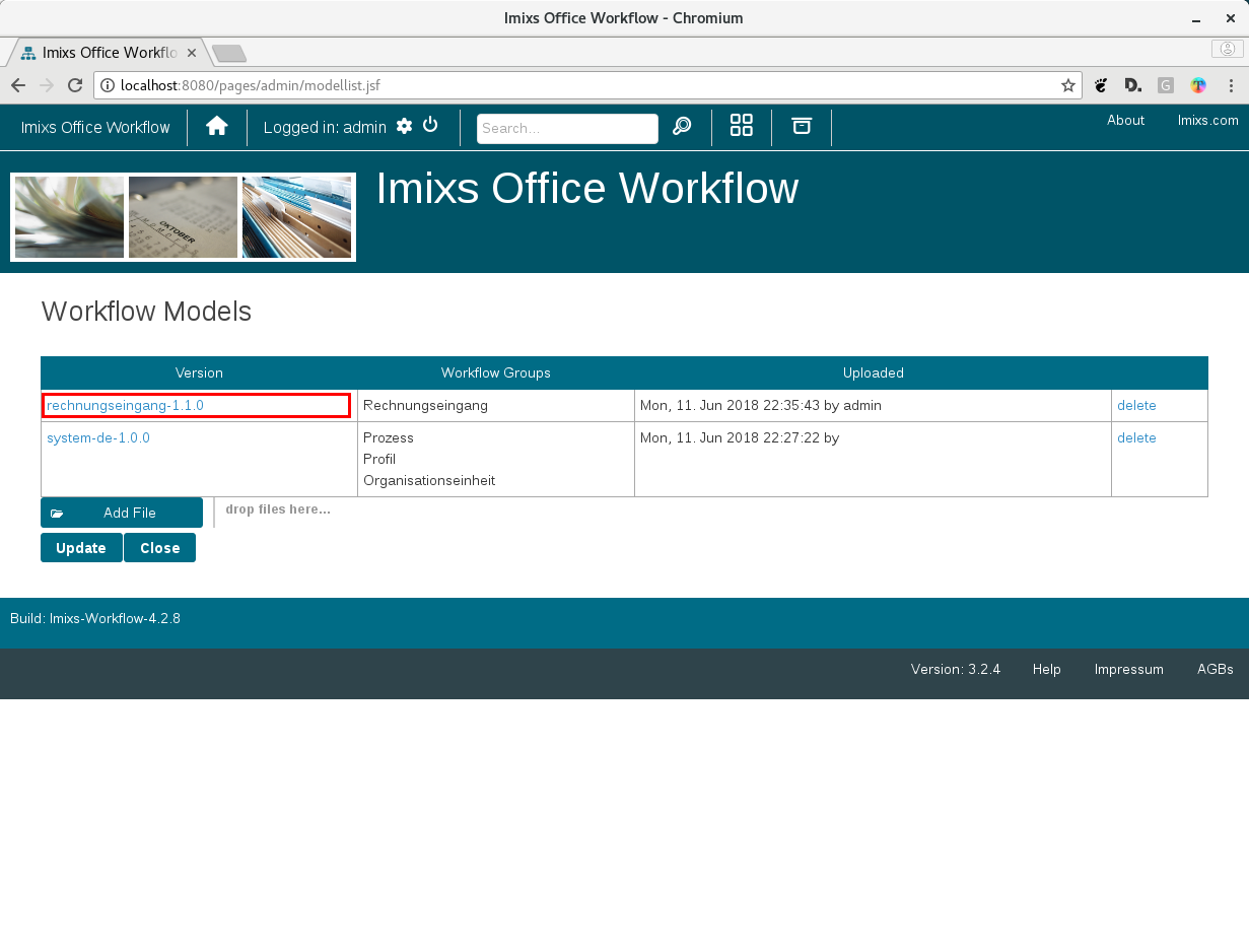 Go to Administration → Models and upload a BPMN file. Ready-to-use templates are available in the Dynamixs.AI BPMN Library.