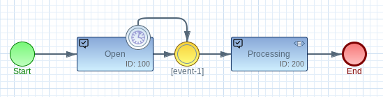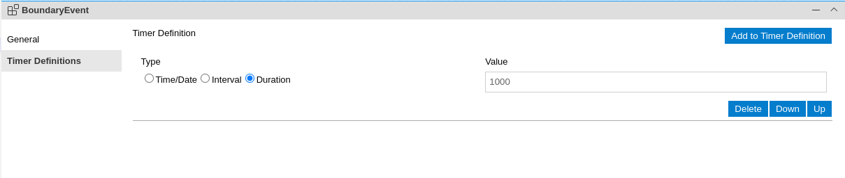 In the BPMN model, an Async Event is modelled as a Timer Boundary Event attached to a Task. The timer value defines the delay before the event is executed — for immediate background processing, a short value like 1000 (milliseconds) is typically sufficient.
